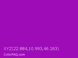 XYZ 22.884,10.993,46.263 Color is a normal purple color and the nearest color is Heliotrope Magenta #aa00bb. Hex code #9e0cb8 and RGB value is rgb(158,12,184). In RGB color space, this color is composed of 62% red, 5% green, 72% blue, In CMYK color space, this color is composed of 14% cyan, 93% magenta, 0% yellow , 28% black , In HSL color space, this color has a hue angle of 291° , 88% saturation and 38% lightness.