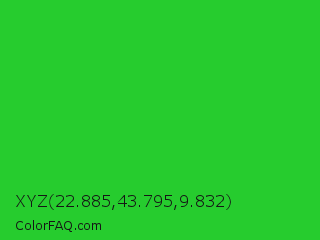 XYZ 22.885,43.795,9.832 Color is a normal green color and the nearest color is Lime Green #32cd32. Hex code #26cc2e and RGB value is rgb(38,204,46). In RGB color space, this color is composed of 15% red, 80% green, 18% blue, In CMYK color space, this color is composed of 81% cyan, 0% magenta, 77% yellow , 20% black , In HSL color space, this color has a hue angle of 123° , 69% saturation and 47% lightness.