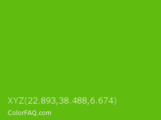 XYZ 22.893,38.488,6.674 Color is a normal green color and the nearest color is Kelly Green #4cbb17. Hex code #60bc0f and RGB value is rgb(96,188,15). In RGB color space, this color is composed of 38% red, 74% green, 6% blue, In CMYK color space, this color is composed of 49% cyan, 0% magenta, 92% yellow , 26% black , In HSL color space, this color has a hue angle of 92° , 85% saturation and 40% lightness.