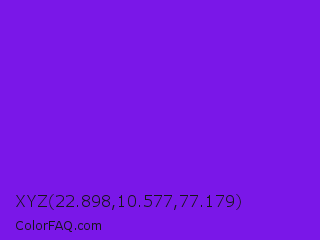XYZ 22.898,10.577,77.179 Color is a normal violet color and the nearest color is Blue Violet #8a2be2. Hex code #7a17e8 and RGB value is rgb(122,23,232). In RGB color space, this color is composed of 48% red, 9% green, 91% blue, In CMYK color space, this color is composed of 47% cyan, 90% magenta, 0% yellow , 9% black , In HSL color space, this color has a hue angle of 268° , 82% saturation and 50% lightness.