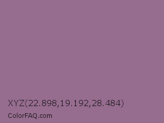 XYZ 22.898,19.192,28.484 Color is a normal magenta color and the nearest color is Strikemaster #956387. Hex code #966c8f and RGB value is rgb(150,108,143). In RGB color space, this color is composed of 59% red, 42% green, 56% blue, In CMYK color space, this color is composed of 0% cyan, 28% magenta, 5% yellow , 41% black , In HSL color space, this color has a hue angle of 310° , 17% saturation and 51% lightness.