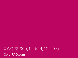 XYZ 22.905,11.644,12.107 Color is a normal rose color and the nearest color is Lipstick #ab0563. Hex code #bc0560 and RGB value is rgb(188,5,96). In RGB color space, this color is composed of 74% red, 2% green, 38% blue, In CMYK color space, this color is composed of 0% cyan, 97% magenta, 49% yellow , 26% black , In HSL color space, this color has a hue angle of 330° , 95% saturation and 38% lightness.