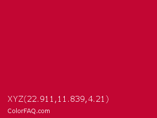 XYZ 22.911,11.839,4.21 Color is a normal red color and the nearest color is Red NCS #c40233. Hex code #c20633 and RGB value is rgb(194,6,51). In RGB color space, this color is composed of 76% red, 2% green, 20% blue, In CMYK color space, this color is composed of 0% cyan, 97% magenta, 74% yellow , 24% black , In HSL color space, this color has a hue angle of 346° , 94% saturation and 39% lightness.