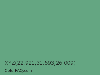 XYZ 22.921,31.593,26.009 Color is a normal green color and the nearest color is Shiny Shamrock #5fa778. Hex code #64a682 and RGB value is rgb(100,166,130). In RGB color space, this color is composed of 39% red, 65% green, 51% blue, In CMYK color space, this color is composed of 40% cyan, 0% magenta, 22% yellow , 35% black , In HSL color space, this color has a hue angle of 147° , 27% saturation and 52% lightness.