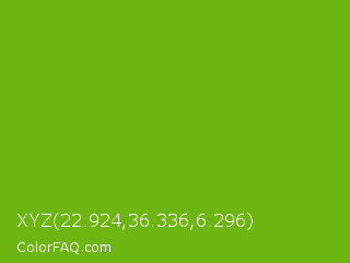 XYZ 22.924,36.336,6.296 Color is a normal green color and the nearest color is Lima #76bd17. Hex code #6db510 and RGB value is rgb(109,181,16). In RGB color space, this color is composed of 43% red, 71% green, 6% blue, In CMYK color space, this color is composed of 40% cyan, 0% magenta, 91% yellow , 29% black , In HSL color space, this color has a hue angle of 86° , 84% saturation and 39% lightness.