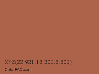 XYZ 22.931,18.302,8.803 Color is a normal color and the nearest color is Giants Club #b05c52. Hex code #ad634a and RGB value is rgb(173,99,74). In RGB color space, this color is composed of 68% red, 39% green, 29% blue, In CMYK color space, this color is composed of 0% cyan, 43% magenta, 57% yellow , 32% black , In HSL color space, this color has a hue angle of 15° , 40% saturation and 48% lightness.