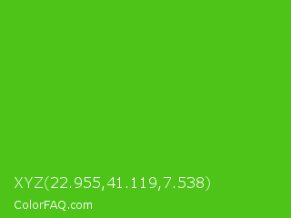 XYZ 22.955,41.119,7.538 Color is a normal green color and the nearest color is Kelly Green #4cbb17. Hex code #4dc417 and RGB value is rgb(77,196,23). In RGB color space, this color is composed of 30% red, 77% green, 9% blue, In CMYK color space, this color is composed of 61% cyan, 0% magenta, 88% yellow , 23% black , In HSL color space, this color has a hue angle of 101° , 79% saturation and 43% lightness.