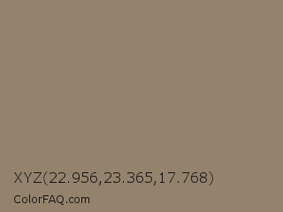 XYZ 22.956,23.365,17.768 Color is a normal orange color and the nearest color is Arrowtown #948771. Hex code #94826d and RGB value is rgb(148,130,109). In RGB color space, this color is composed of 58% red, 51% green, 43% blue, In CMYK color space, this color is composed of 0% cyan, 12% magenta, 26% yellow , 42% black , In HSL color space, this color has a hue angle of 32° , 15% saturation and 50% lightness.