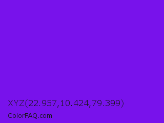 XYZ 22.957,10.424,79.399 Color is a normal violet color and the nearest color is Violet Color Wheel #7f00ff. Hex code #7812eb and RGB value is rgb(120,18,235). In RGB color space, this color is composed of 47% red, 7% green, 92% blue, In CMYK color space, this color is composed of 49% cyan, 92% magenta, 0% yellow , 8% black , In HSL color space, this color has a hue angle of 268° , 86% saturation and 50% lightness.