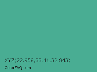 XYZ 22.958,33.41,32.843 Color is a normal cyan color and the nearest color is Mint #3eb489. Hex code #49ad93 and RGB value is rgb(73,173,147). In RGB color space, this color is composed of 29% red, 68% green, 58% blue, In CMYK color space, this color is composed of 58% cyan, 0% magenta, 15% yellow , 32% black , In HSL color space, this color has a hue angle of 164° , 41% saturation and 48% lightness.