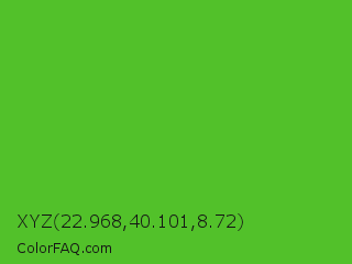 XYZ 22.968,40.101,8.72 Color is a normal green color and the nearest color is Kelly Green #4cbb17. Hex code #52c12a and RGB value is rgb(82,193,42). In RGB color space, this color is composed of 32% red, 76% green, 16% blue, In CMYK color space, this color is composed of 58% cyan, 0% magenta, 78% yellow , 24% black , In HSL color space, this color has a hue angle of 104° , 64% saturation and 46% lightness.