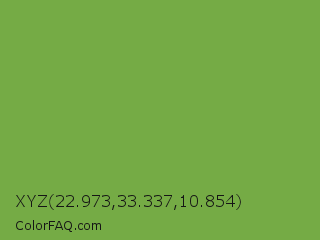 XYZ 22.973,33.337,10.854 Color is a normal green color and the nearest color is Palm Leaf #6f9940. Hex code #75ab45 and RGB value is rgb(117,171,69). In RGB color space, this color is composed of 46% red, 67% green, 27% blue, In CMYK color space, this color is composed of 32% cyan, 0% magenta, 60% yellow , 33% black , In HSL color space, this color has a hue angle of 92° , 43% saturation and 47% lightness.