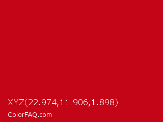 XYZ 22.974,11.906,1.898 Color is a normal red color and the nearest color is Venetian Red #c80815. Hex code #c40517 and RGB value is rgb(196,5,23). In RGB color space, this color is composed of 77% red, 2% green, 9% blue, In CMYK color space, this color is composed of 0% cyan, 97% magenta, 88% yellow , 23% black , In HSL color space, this color has a hue angle of 354° , 95% saturation and 39% lightness.