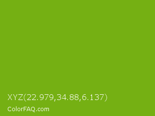 XYZ 22.979,34.88,6.137 Color is a normal green color and the nearest color is Lima #76bd17. Hex code #75b013 and RGB value is rgb(117,176,19). In RGB color space, this color is composed of 46% red, 69% green, 7% blue, In CMYK color space, this color is composed of 34% cyan, 0% magenta, 89% yellow , 31% black , In HSL color space, this color has a hue angle of 83° , 81% saturation and 38% lightness.