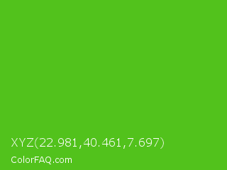 XYZ 22.981,40.461,7.697 Color is a normal green color and the nearest color is Kelly Green #4cbb17. Hex code #52c21c and RGB value is rgb(82,194,28). In RGB color space, this color is composed of 32% red, 76% green, 11% blue, In CMYK color space, this color is composed of 58% cyan, 0% magenta, 86% yellow , 24% black , In HSL color space, this color has a hue angle of 100° , 75% saturation and 44% lightness.