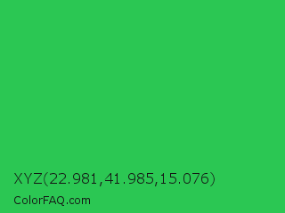 XYZ 22.981,41.985,15.076 Color is a normal green color and the nearest color is Lime Green #32cd32. Hex code #2bc753 and RGB value is rgb(43,199,83). In RGB color space, this color is composed of 17% red, 78% green, 33% blue, In CMYK color space, this color is composed of 78% cyan, 0% magenta, 58% yellow , 22% black , In HSL color space, this color has a hue angle of 135° , 64% saturation and 47% lightness.