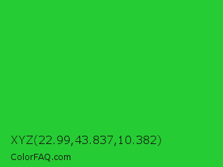 XYZ 22.99,43.837,10.382 Color is a normal green color and the nearest color is Lime Green #32cd32. Hex code #26cc33 and RGB value is rgb(38,204,51). In RGB color space, this color is composed of 15% red, 80% green, 20% blue, In CMYK color space, this color is composed of 81% cyan, 0% magenta, 75% yellow , 20% black , In HSL color space, this color has a hue angle of 125° , 69% saturation and 47% lightness.