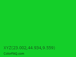 XYZ 23.002,44.934,9.559 Color is a normal green color and the nearest color is Vivid Malachite #00cc33. Hex code #14cf29 and RGB value is rgb(20,207,41). In RGB color space, this color is composed of 8% red, 81% green, 16% blue, In CMYK color space, this color is composed of 90% cyan, 0% magenta, 80% yellow , 19% black , In HSL color space, this color has a hue angle of 127° , 82% saturation and 45% lightness.