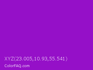 XYZ 23.005,10.93,55.541 Color is a normal purple color and the nearest color is French Violet #8806ce. Hex code #9510c8 and RGB value is rgb(149,16,200). In RGB color space, this color is composed of 58% red, 6% green, 78% blue, In CMYK color space, this color is composed of 26% cyan, 92% magenta, 0% yellow , 22% black , In HSL color space, this color has a hue angle of 283° , 85% saturation and 42% lightness.