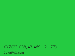 XYZ 23.038,43.469,12.177 Color is a normal green color and the nearest color is Lime Green #32cd32. Hex code #24cb41 and RGB value is rgb(36,203,65). In RGB color space, this color is composed of 14% red, 80% green, 25% blue, In CMYK color space, this color is composed of 82% cyan, 0% magenta, 68% yellow , 20% black , In HSL color space, this color has a hue angle of 130° , 70% saturation and 47% lightness.