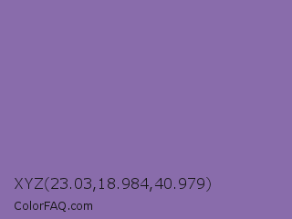 XYZ 23.03,18.984,40.979 Color is a normal violet color and the nearest color is Wisteria #9771b5. Hex code #896cab and RGB value is rgb(137,108,171). In RGB color space, this color is composed of 54% red, 42% green, 67% blue, In CMYK color space, this color is composed of 20% cyan, 37% magenta, 0% yellow , 33% black , In HSL color space, this color has a hue angle of 268° , 27% saturation and 55% lightness.