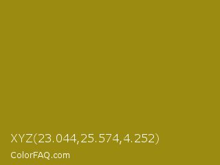 XYZ 23.044,25.574,4.252 Color is a normal yellow color and the nearest color is Dark Yellow #9b870c. Hex code #9c8b11 and RGB value is rgb(156,139,17). In RGB color space, this color is composed of 61% red, 55% green, 7% blue, In CMYK color space, this color is composed of 0% cyan, 11% magenta, 89% yellow , 39% black , In HSL color space, this color has a hue angle of 53° , 80% saturation and 34% lightness.