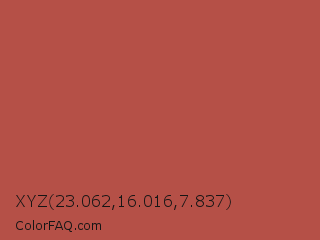 XYZ 23.062,16.016,7.837 Color is a normal red color and the nearest color is Deep Chestnut #b94e48. Hex code #b55047 and RGB value is rgb(181,80,71). In RGB color space, this color is composed of 71% red, 31% green, 28% blue, In CMYK color space, this color is composed of 0% cyan, 56% magenta, 61% yellow , 29% black , In HSL color space, this color has a hue angle of 5° , 44% saturation and 49% lightness.