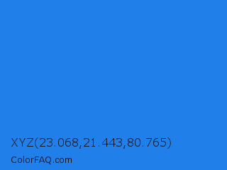 XYZ 23.068,21.443,80.765 Color is a normal blue color and the nearest color is Bleu De France #318ce7. Hex code #217fea and RGB value is rgb(33,127,234). In RGB color space, this color is composed of 13% red, 50% green, 92% blue, In CMYK color space, this color is composed of 86% cyan, 46% magenta, 0% yellow , 8% black , In HSL color space, this color has a hue angle of 212° , 83% saturation and 52% lightness.