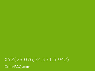 XYZ 23.076,34.934,5.942 Color is a normal green color and the nearest color is Lima #76bd17. Hex code #76b00e and RGB value is rgb(118,176,14). In RGB color space, this color is composed of 46% red, 69% green, 5% blue, In CMYK color space, this color is composed of 33% cyan, 0% magenta, 92% yellow , 31% black , In HSL color space, this color has a hue angle of 81° , 85% saturation and 37% lightness.