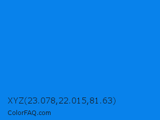 XYZ 23.078,22.015,81.63 Color is a normal blue color and the nearest color is Azure Radiance #007fff. Hex code #0882eb and RGB value is rgb(8,130,235). In RGB color space, this color is composed of 3% red, 51% green, 92% blue, In CMYK color space, this color is composed of 97% cyan, 45% magenta, 0% yellow , 8% black , In HSL color space, this color has a hue angle of 208° , 93% saturation and 48% lightness.