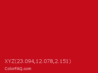 XYZ 23.094,12.078,2.151 Color is a normal red color and the nearest color is Venetian Red #c80815. Hex code #c40c1b and RGB value is rgb(196,12,27). In RGB color space, this color is composed of 77% red, 5% green, 11% blue, In CMYK color space, this color is composed of 0% cyan, 94% magenta, 86% yellow , 23% black , In HSL color space, this color has a hue angle of 355° , 88% saturation and 41% lightness.