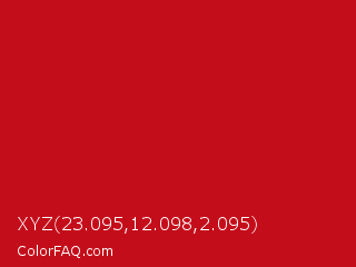 XYZ 23.095,12.098,2.095 Color is a normal red color and the nearest color is Venetian Red #c80815. Hex code #c40d1a and RGB value is rgb(196,13,26). In RGB color space, this color is composed of 77% red, 5% green, 10% blue, In CMYK color space, this color is composed of 0% cyan, 93% magenta, 87% yellow , 23% black , In HSL color space, this color has a hue angle of 356° , 88% saturation and 41% lightness.