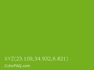 XYZ 23.109,34.932,6.821 Color is a normal green color and the nearest color is Lima #76bd17. Hex code #75b01f and RGB value is rgb(117,176,31). In RGB color space, this color is composed of 46% red, 69% green, 12% blue, In CMYK color space, this color is composed of 34% cyan, 0% magenta, 82% yellow , 31% black , In HSL color space, this color has a hue angle of 84° , 70% saturation and 41% lightness.