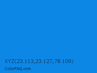 XYZ 23.113,23.127,78.109 Color is a normal blue color and the nearest color is Rich Electric Blue #0892d0. Hex code #0d87e6 and RGB value is rgb(13,135,230). In RGB color space, this color is composed of 5% red, 53% green, 90% blue, In CMYK color space, this color is composed of 94% cyan, 41% magenta, 0% yellow , 10% black , In HSL color space, this color has a hue angle of 206° , 89% saturation and 48% lightness.
