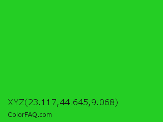 XYZ 23.117,44.645,9.068 Color is a normal green color and the nearest color is Lime Green #32cd32. Hex code #24ce24 and RGB value is rgb(36,206,36). In RGB color space, this color is composed of 14% red, 81% green, 14% blue, In CMYK color space, this color is composed of 83% cyan, 0% magenta, 83% yellow , 19% black , In HSL color space, this color has a hue angle of 120° , 70% saturation and 47% lightness.