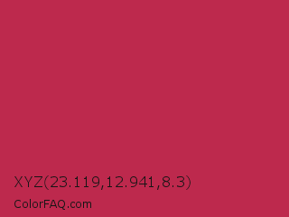 XYZ 23.119,12.941,8.3 Color is a normal red color and the nearest color is Maroon Flush #c32148. Hex code #bd294d and RGB value is rgb(189,41,77). In RGB color space, this color is composed of 74% red, 16% green, 30% blue, In CMYK color space, this color is composed of 0% cyan, 78% magenta, 59% yellow , 26% black , In HSL color space, this color has a hue angle of 345° , 64% saturation and 45% lightness.