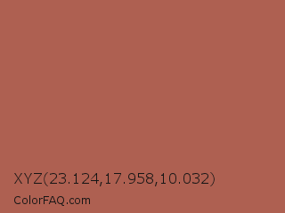 XYZ 23.124,17.958,10.032 Color is a normal red color and the nearest color is Giants Club #b05c52. Hex code #ae6051 and RGB value is rgb(174,96,81). In RGB color space, this color is composed of 68% red, 38% green, 32% blue, In CMYK color space, this color is composed of 0% cyan, 45% magenta, 53% yellow , 32% black , In HSL color space, this color has a hue angle of 10° , 36% saturation and 50% lightness.