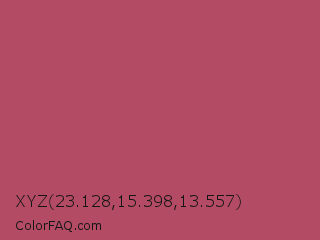 XYZ 23.128,15.398,13.557 Color is a normal red color and the nearest color is Deep Blush #b44668. Hex code #b24b63 and RGB value is rgb(178,75,99). In RGB color space, this color is composed of 70% red, 29% green, 39% blue, In CMYK color space, this color is composed of 0% cyan, 58% magenta, 44% yellow , 30% black , In HSL color space, this color has a hue angle of 346° , 41% saturation and 50% lightness.
