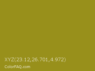 XYZ 23.12,26.701,4.972 Color is a normal yellow color and the nearest color is Hacienda #98811b. Hex code #98901b and RGB value is rgb(152,144,27). In RGB color space, this color is composed of 60% red, 56% green, 11% blue, In CMYK color space, this color is composed of 0% cyan, 5% magenta, 82% yellow , 40% black , In HSL color space, this color has a hue angle of 56° , 70% saturation and 35% lightness.