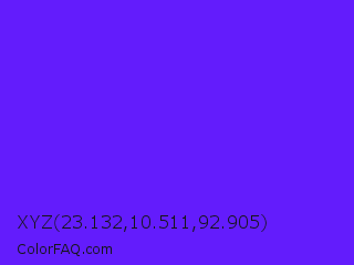 XYZ 23.132,10.511,92.905 Color is a normal indigo color and the nearest color is Han Purple #5218fa. Hex code #631cfc and RGB value is rgb(99,28,252). In RGB color space, this color is composed of 39% red, 11% green, 99% blue, In CMYK color space, this color is composed of 61% cyan, 89% magenta, 0% yellow , 1% black , In HSL color space, this color has a hue angle of 259° , 97% saturation and 55% lightness.