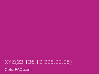 XYZ 23.136,12.228,22.26 Color is a normal magenta color and the nearest color is Fandango #b53389. Hex code #b32082 and RGB value is rgb(179,32,130). In RGB color space, this color is composed of 70% red, 13% green, 51% blue, In CMYK color space, this color is composed of 0% cyan, 82% magenta, 27% yellow , 30% black , In HSL color space, this color has a hue angle of 320° , 70% saturation and 41% lightness.
