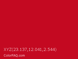 XYZ 23.137,12.041,2.544 Color is a normal red color and the nearest color is Monza #c7031e. Hex code #c40921 and RGB value is rgb(196,9,33). In RGB color space, this color is composed of 77% red, 4% green, 13% blue, In CMYK color space, this color is composed of 0% cyan, 95% magenta, 83% yellow , 23% black , In HSL color space, this color has a hue angle of 352° , 91% saturation and 40% lightness.