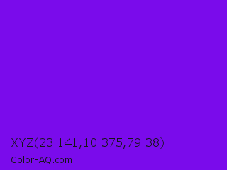 XYZ 23.141,10.375,79.38 Color is a normal violet color and the nearest color is Violet Color Wheel #7f00ff. Hex code #7a0beb and RGB value is rgb(122,11,235). In RGB color space, this color is composed of 48% red, 4% green, 92% blue, In CMYK color space, this color is composed of 48% cyan, 95% magenta, 0% yellow , 8% black , In HSL color space, this color has a hue angle of 270° , 91% saturation and 48% lightness.