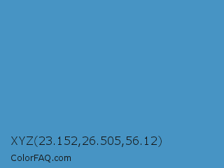 XYZ 23.152,26.505,56.12 Color is a normal blue color and the nearest color is Celestial Blue #4997d0. Hex code #4794c4 and RGB value is rgb(71,148,196). In RGB color space, this color is composed of 28% red, 58% green, 77% blue, In CMYK color space, this color is composed of 64% cyan, 24% magenta, 0% yellow , 23% black , In HSL color space, this color has a hue angle of 203° , 51% saturation and 52% lightness.