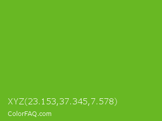XYZ 23.153,37.345,7.578 Color is a normal green color and the nearest color is Green RYB #66b032. Hex code #68b823 and RGB value is rgb(104,184,35). In RGB color space, this color is composed of 41% red, 72% green, 14% blue, In CMYK color space, this color is composed of 43% cyan, 0% magenta, 81% yellow , 28% black , In HSL color space, this color has a hue angle of 92° , 68% saturation and 43% lightness.
