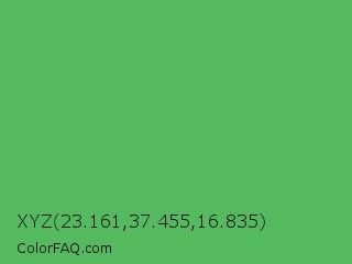 XYZ 23.161,37.455,16.835 Color is a normal green color and the nearest color is Fern #63b76c. Hex code #55b95f and RGB value is rgb(85,185,95). In RGB color space, this color is composed of 33% red, 73% green, 37% blue, In CMYK color space, this color is composed of 54% cyan, 0% magenta, 49% yellow , 27% black , In HSL color space, this color has a hue angle of 126° , 42% saturation and 53% lightness.