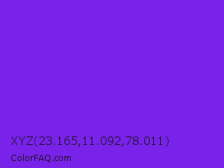 XYZ 23.165,11.092,78.011 Color is a normal violet color and the nearest color is Blue Violet #8a2be2. Hex code #7922e9 and RGB value is rgb(121,34,233). In RGB color space, this color is composed of 47% red, 13% green, 91% blue, In CMYK color space, this color is composed of 48% cyan, 85% magenta, 0% yellow , 9% black , In HSL color space, this color has a hue angle of 266° , 82% saturation and 52% lightness.