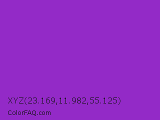 XYZ 23.169,11.982,55.125 Color is a normal purple color and the nearest color is Dark Orchid #9932cc. Hex code #932ac7 and RGB value is rgb(147,42,199). In RGB color space, this color is composed of 58% red, 16% green, 78% blue, In CMYK color space, this color is composed of 26% cyan, 79% magenta, 0% yellow , 22% black , In HSL color space, this color has a hue angle of 280° , 65% saturation and 47% lightness.