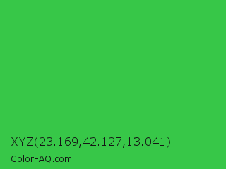 XYZ 23.169,42.127,13.041 Color is a normal green color and the nearest color is Lime Green #32cd32. Hex code #37c748 and RGB value is rgb(55,199,72). In RGB color space, this color is composed of 22% red, 78% green, 28% blue, In CMYK color space, this color is composed of 72% cyan, 0% magenta, 64% yellow , 22% black , In HSL color space, this color has a hue angle of 127° , 57% saturation and 50% lightness.