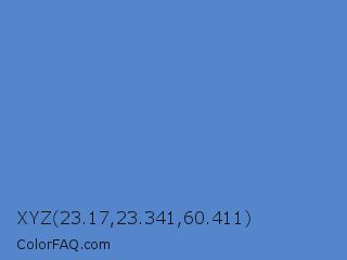 XYZ 23.17,23.341,60.411 Color is a normal blue color and the nearest color is Havelock Blue #5590d9. Hex code #5586cc and RGB value is rgb(85,134,204). In RGB color space, this color is composed of 33% red, 53% green, 80% blue, In CMYK color space, this color is composed of 58% cyan, 34% magenta, 0% yellow , 20% black , In HSL color space, this color has a hue angle of 215° , 54% saturation and 57% lightness.